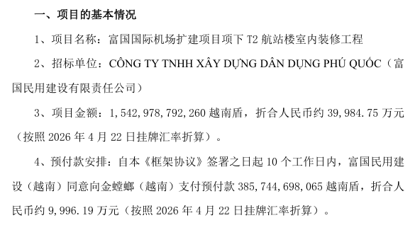 4月22日晚间,金螳螂披露,孙公司金螳螂(越南)建筑有限公司与富国民用建设有限责任公司(越南)于近日签署了《框架协议》。根据协议,金螳螂(越南)被选定为富国国际机场扩建项目项下T2航站楼室内装修工程(天花—墙面—地面)招标包的主要承包商。项目金额为15429.79亿越南盾,折合人民币约4亿元。根据预付款安排,自协议签署之日起10个工作日内,富国民用建设(越南)同意向金螳螂(越南)支付预付款3857.45亿越南盾,折合人民币约9996.19万元。
