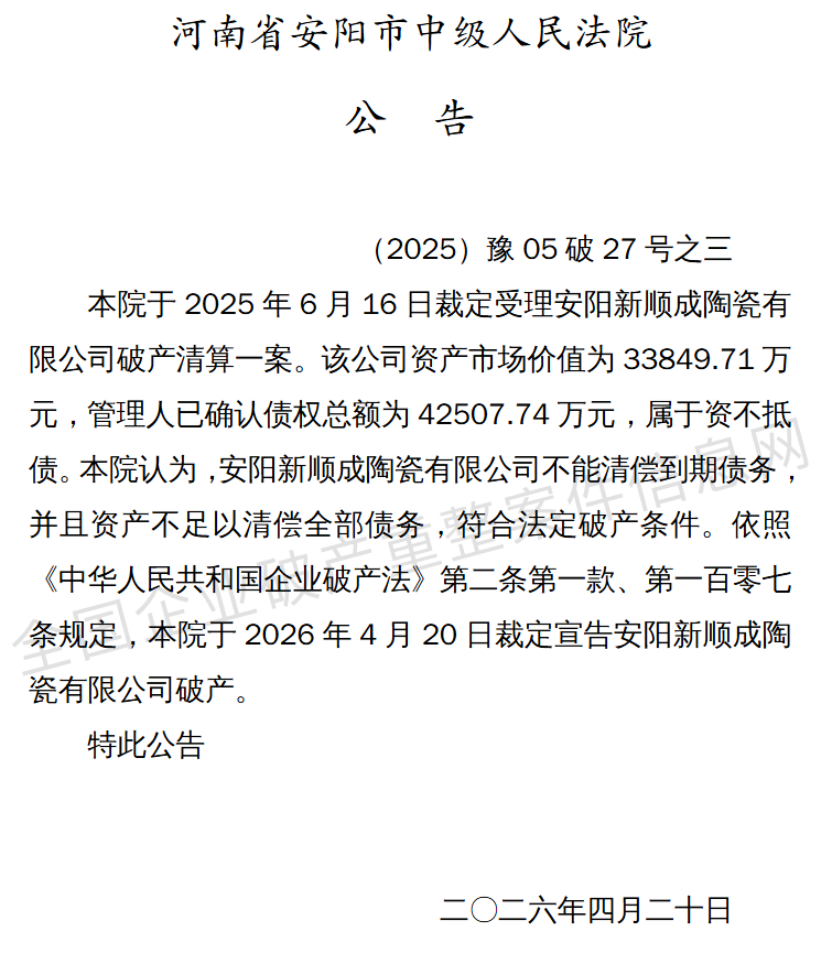 河南省安阳市中级人民法院近日发布公告,于2026年4月20日裁定宣告安阳新顺成陶瓷有限公司破产。该公司资产市场价值为3.38亿元,管理人已确认债权总额为4.25亿元,严重资不抵债,已符合法定破产条件。