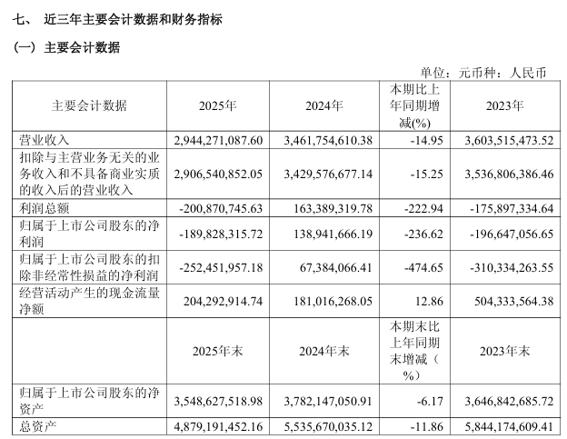惠达卫浴股份有限公司日前披露2025年年度报告。报告显示,公司全年实现营业收入29.44亿元,同比减少14.95%;归属于上市公司股东的净利润为-1.90亿元,上年同期为盈利,同比由盈转亏。