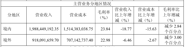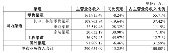 分产品来看,卫生陶瓷实现营业收入16.44亿元,同比下降15.88%,毛利率23.99%,同比减少3.43个百分点;浴缸淋浴房实现营业收入1.16亿元,同比下降18.32%,毛利率26.61%;墙地砖实现营业收入2.49亿元,同比下降41.44%,毛利率为-1.92%;五金洁具实现营业收入4.33亿元,同比下降11.58%,毛利率33.44%;浴室柜实现营业收入3.13亿元,同比增长26.23%,毛利率30.85%。分地区来看,境内市场实现营业收入19.88亿元,同比下降18.77%;境外市场实现营业收入9.18亿元,同比下降6.46%。