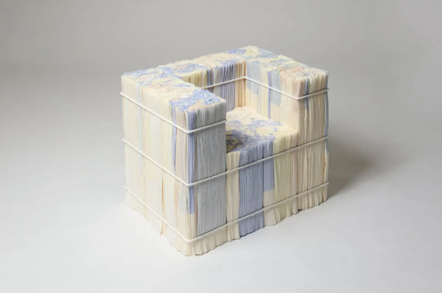更深入的实验是给纸卷浸蜡。蜡渗进纸层,固化后纸卷变得像石头。切开来,内部的纹理像被时间侵蚀的大理石,颜色更饱和,触感是冷的。浸蜡纸卷被水刀切割机锐利地切成砖块,垂直切片的边桌保留了纸卷原始的放射状纹理。还有胶水处理过的凳子,靠背带着柔和的弧形。一件扶手椅没有上蜡,多层纸张捆在一起,蓬松柔软,像一朵云,金属框架把云的轮廓框住,人坐上去,纸托住身体。近藤悟说:“有时它看起来像木头,有时像岩石或大理石。有一种随机的、未完成的美。它总是不可预测、令人惊喜。”