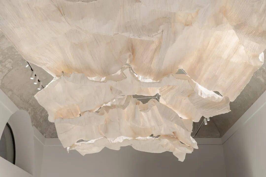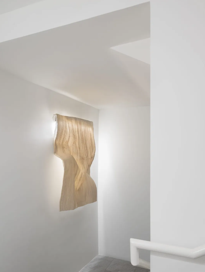 “壳”的部分,三宅一生把约二十个纸卷寄到了马德里Ensamble Studio的工作室,邀请他们自由实验。Ensamble没有把纸卷当成固体,他们像剥树皮一样把纸剥开,还原成原始纸张的薄片,然后把薄纸覆盖在物件上——家具、框架、悬吊结构,手工涂上树脂和乳胶,把每一个褶皱、每一条曲线冻在时间和位置里。结果是一系列半透明的“壳”——轻盈、透光、可触。勒·柯布西耶躺椅的轮廓被纸壳重新勾勒出来,变成一件可穿脱的第二层皮肤。纸灯罩挂在旗舰店古老建筑的天花板上,光从纸的肌理间渗出来。纸在这里不是材料,是记忆的拓片。物件的形状留在纸上,纸变成物件的影子。