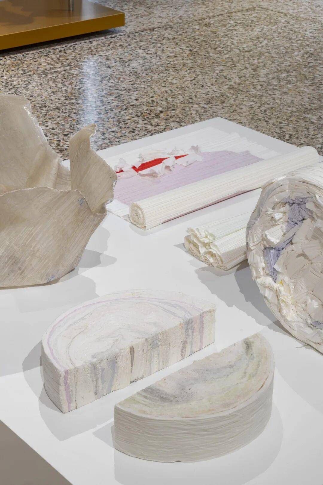 这些纸来自三宅一生服装的压褶过程。衣服被送进压褶机时,纸张夹在衣服之间作为保护层,然后被压缩。日积月累,纸张层层叠叠,压成高80厘米、直径40厘米的致密纸卷。纸卷里带着粉色、蓝色、灰色、黄色的细密大理石纹——那是衣服经过时留下的痕迹。
