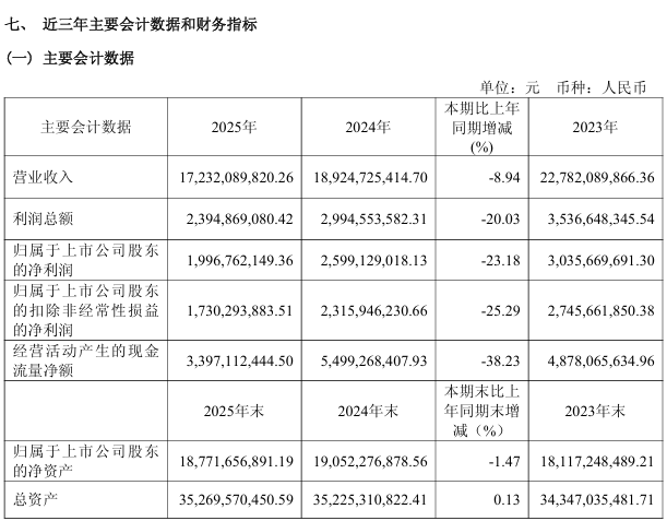 4月24日,欧派家居集团股份有限公司(简称“欧派家居”)披露2025年年度报告。报告显示,公司全年实现营业收入172.32亿元,同比下降8.94%;归属于上市公司股东的净利润19.97亿元,同比下降23.18%。公司拟以实施权益分派股权登记日的总股本扣除回购专户股份后的股份总数为基数,向全体股东每股派发现金红利1.237元(含税),不送红股亦不进行资本公积金转增股本。