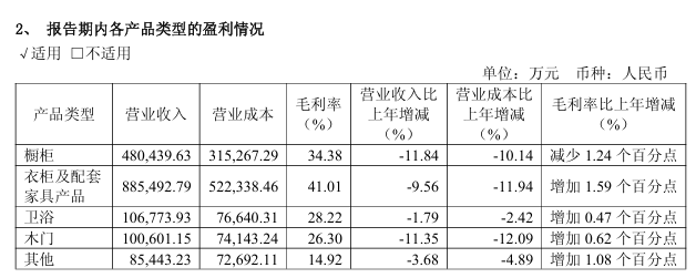 分产品来看,橱柜实现营业收入48.04亿元,同比下降11.84%,毛利率34.38%;衣柜及配套家具产品实现营业收入88.55亿元,同比下降9.56%,毛利率41.01%;卫浴实现营业收入10.68亿元,同比下降1.79%,毛利率28.22%;木门实现营业收入10.06亿元,同比下降11.35%,毛利率26.3%。
