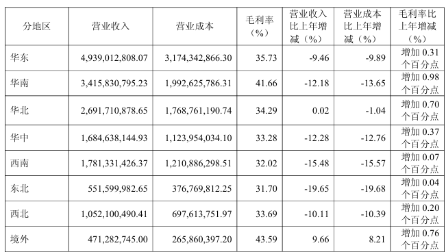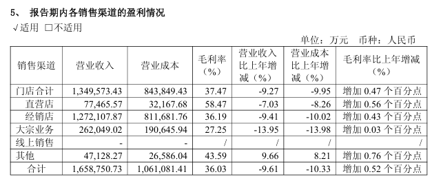 分渠道来看,经销店实现营业收入127.21亿元,同比下降9.41%,毛利率36.19%;直营店实现营业收入7.75亿元,同比下降7.03%,毛利率58.47%;大宗业务实现营业收入26.20亿元,同比下降13.95%,毛利率27.25%;海外渠道实现营业收入4.71亿元,同比增长9.66%。