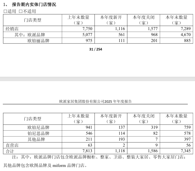 门店方面,截至2025年末,公司经销店数量为7289家,较上年末净减少461家;直营店56家,净减少7家。其中,欧派品牌门店4670家,净减少407家;欧铂丽品牌门店885家,净减少90家;欧铂尼品牌门店759家,净减少182家;铂尼思品牌门店578家,净增加32家。