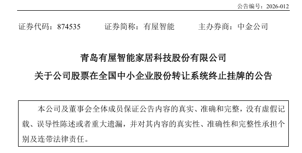 月27日,青岛有屋智能家居科技股份有限公司(简称“有屋智能”)发布公告,公司股票自2026年4月28日起终止在全国中小企业股份转让系统挂牌。有屋智能表示,终止挂牌系出于公司经营及长期战略发展规划的需要,旨在提高决策及经营效率。公司已于2026年2月9日和2月26日分别召开董事会及临时股东会审议通过相关议案,并于2月27日向全国股转公司提交终止挂牌申请并获受理。