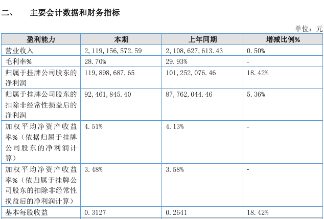 财务数据方面,2025年上半年,公司实现营业收入21.19亿元,同比增长0.5%;归属于挂牌公司股东的净利润1.2亿元,同比增长18.42%。