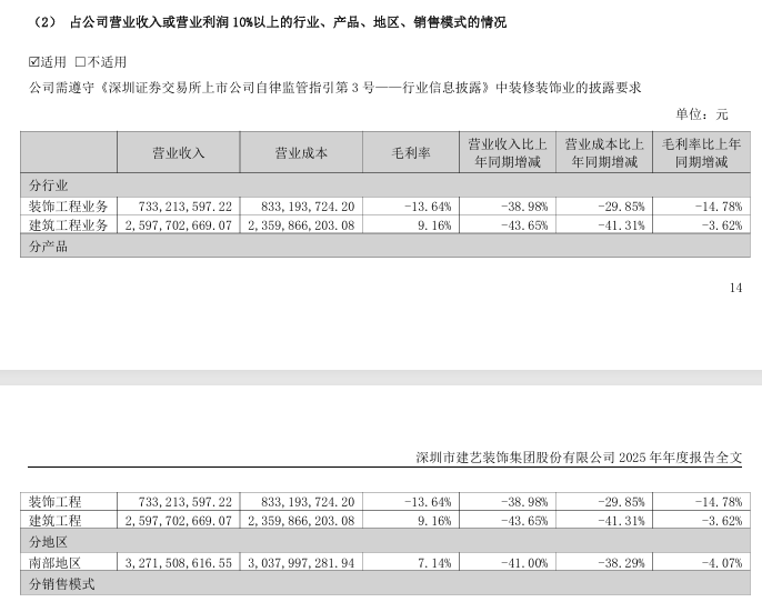 分业务来看,建筑工程业务实现营业收入25.98亿元,同比下降43.65%,占营收比重升至72.31%;装饰工程业务实现营业收入7.33亿元,同比下降38.98%,占比20.41%;二者合计占比达92.72%。新能源业务收入5732万元,同比下降71.60%;装饰设计业务收入1644万元,同比下降44.25%。