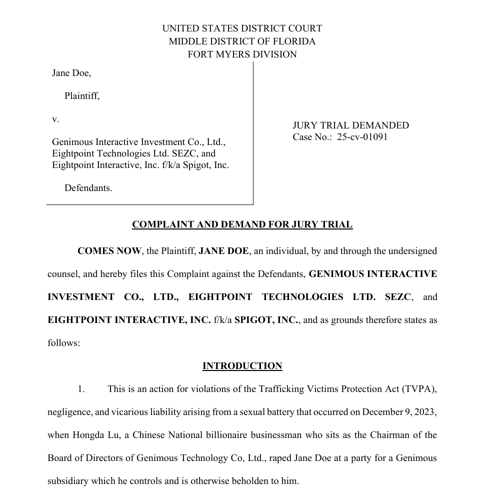 起诉状显示,原告指控,在2023年12月9日,于Spigot公司(即Eightpoint Interactive,Inc.,智度股份境外经营实体之一)在佛罗里达州迈尔斯堡举办的派对后,她遭到陆宏达的性侵。原告作为客人受邀参加此次派对,且并非三家被告公司的员工。