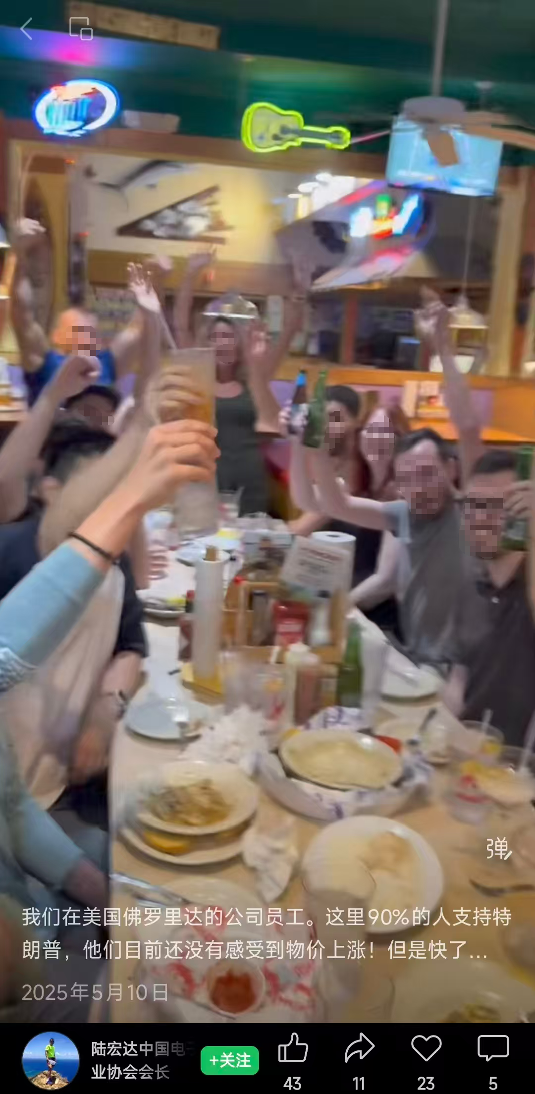 值得一提的是,陆宏达曾在其个人视频号中发布美国员工在派对中饮酒的视频。其发布于2025年5月10日的一则视频配文“我们在美国佛罗里达的公司职员”,画面中众人围坐餐桌,高举酒瓶,对着镜头欢呼,气氛热烈。