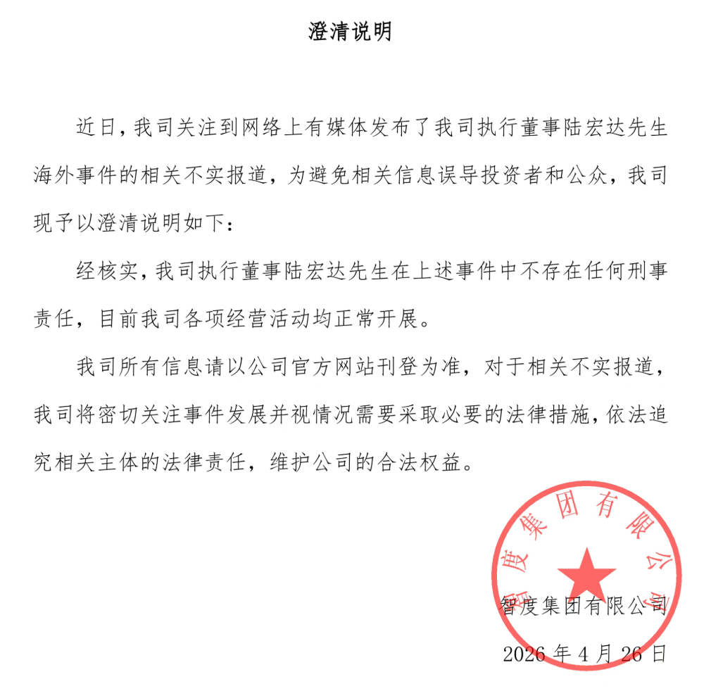 4月26日,智度集团发布澄清说明,称“关注到网络上有媒体发布了我司执行董事陆宏达先生海外事件的相关不实报道,经核实,我司执行董事陆宏达先生在上述事件中不存在任何刑事责任,目前我司各项经营活动均正常开展”。智度股份工作人员表示,公司正在进行自查,后续若有需要将根据信批相关规定履行审批义务,陆宏达本人手机则已处于关机状态。