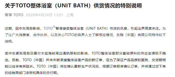 在国际市场方面,TOTO早于4月10日发布官方公告,称受中东局势紧张以及霍尔木兹海峡通航受限等因素影响,原油、石脑油等石油化学基础原料的供应环境正迅速恶化,国内外原材料采购已处于极其不稳定的状态。4月13日,TOTO正式宣布即日起暂停接受整体卫浴的新订单。