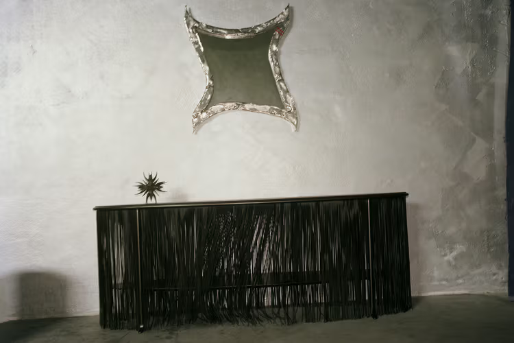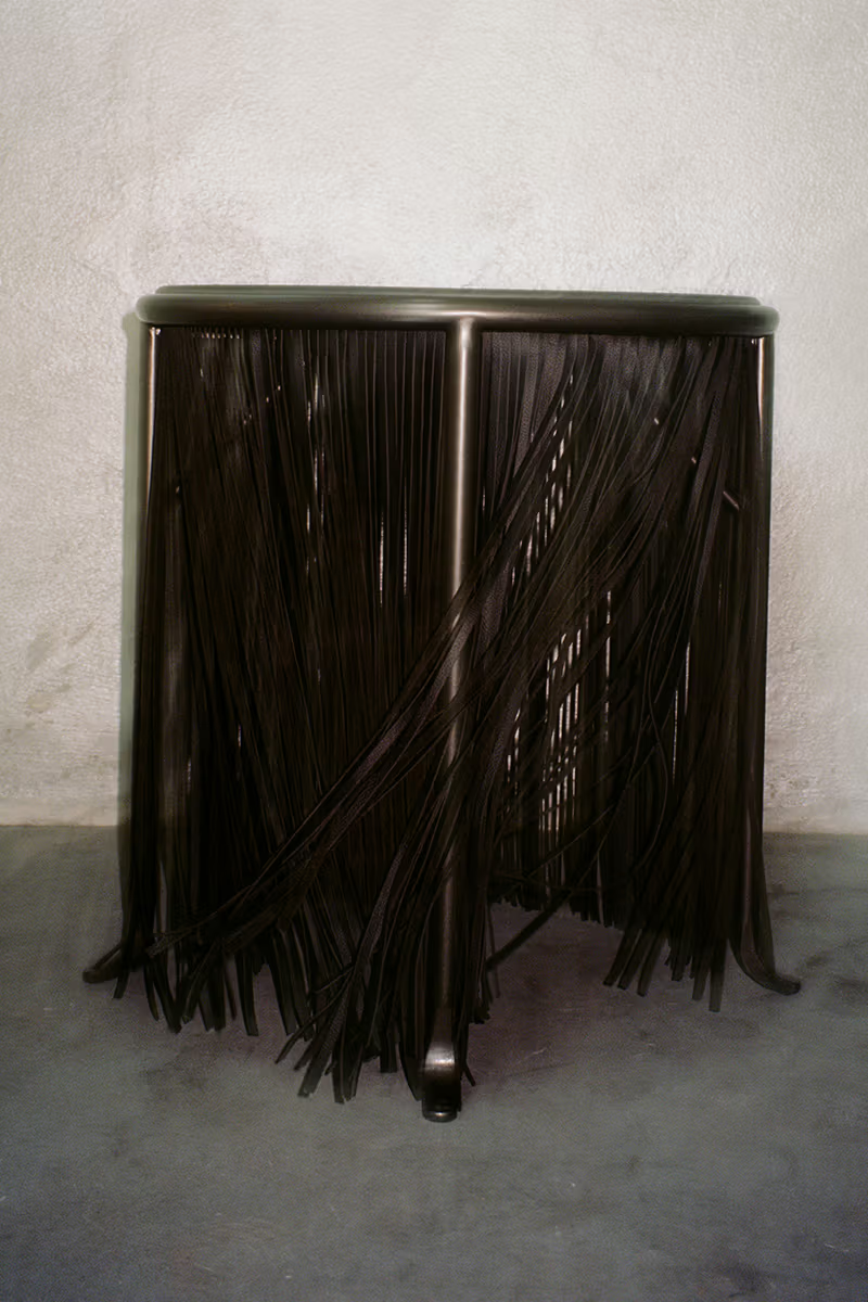 整个系列由多件皮革与钢材作品构成,以层层垂坠、几乎贴地却又微微悬浮的流苏去柔化结构;当你绕着它们移动时,那些流苏也会随之轻微晃动。