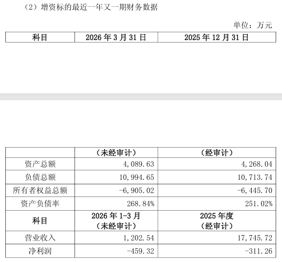 公告显示,广东志邦成立于2019年4月,主要从事家居零售业务,包括家具、灯具、五金、卫生洁具零售及室内装饰装修等。截至2025年12月31日,广东志邦资产总额4268.04万元,负债总额1.07亿元,所有者权益为-6445.70万元,资产负债率达251.02%。2025年度,公司实现营业收入1.77亿元,净利润亏损311.26万元。2026年第一季度,营业收入1202.54万元,净利润亏损459.32万元,所有者权益进一步降至-6905.02万元,资产负债率攀升至268.84%。